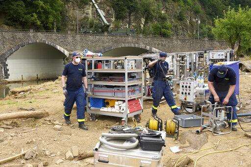 Volunteers dismantle a drinking water treatment plant in order to rebuild it on higher ground in Schuld, Germany, Thursday July 22, 2021. More rain is forecast for the region over the coming weekend. In the flood disaster area of Erftstadt-Blessem, some residents are being allowed back into their homes to clear debris after heavy rains caused devastating floods. (Thomas Frey/dpa via AP) The Associated Press