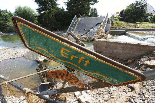 A location sign for the river Erft lies in the rubble in front of a destroyed bridge, in Stotzheim, Germany Thursday July 22, 2021. Heavy rains have caused devastating floods over much of the region, (David Young/dpa via AP) The Associated Press