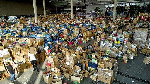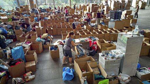 Volunteers sort donations at the donation centre on the Ring Boulevard of Nurburg, Germany, before they are delivered to the flood disaster area, Thursday July 22, 2021. In the flood disaster area of Erftstadt-Blessem, some residents are being allowed back into their homes to clear debris after heavy rains caused devastating floods. (Thomas Frey/dpa via AP) The Associated Press