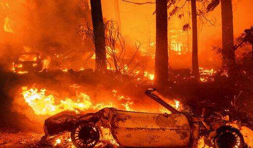 Flames consume vehicles as the Dixie Fire tears through the Indian Falls community in Plumas County, Calif., Saturday, July 24, 2021. The fire destroyed multiple residences in the area. (AP Photo/Noah Berger)