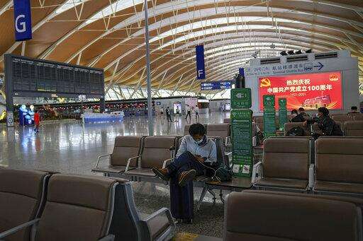 Passengers take rest near a blank flights information board at Pudong International Airport in Shanghai, China, Sunday, July 25, 2021. Airline flights were canceled in eastern China and cargo ships were ordered out of the area Saturday as Typhoon In-fa churned toward the mainland after dumping rain on Taiwan. (AP Photo/Andy Wong)