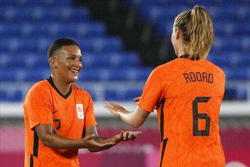 Netherlands' Shanice van de Sanden, left, celebrates with Jill Roord after scoring a goal during a women's soccer match against China at the 2020 Summer Olympics, Tuesday, July 27, 2021, in Yokohama, Japan. (AP Photo/Kiichiro Sato) The Associated Press