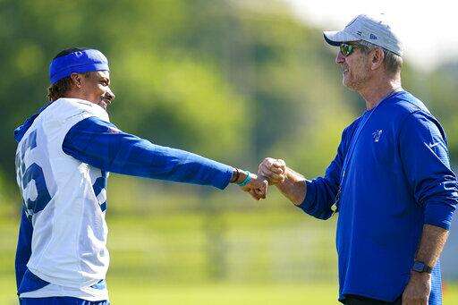 Indianapolis Colts head coach Frank Reich greets wide receiver DeMichael Harris before the start of practice at the NFL team's football training camp in Westfield, Ind., Monday, Aug. 2, 2021. Reich returned to practice following his quarantine period and two negative tests after a positive test for COVID-19. (AP Photo/Michael Conroy) The Associated Press