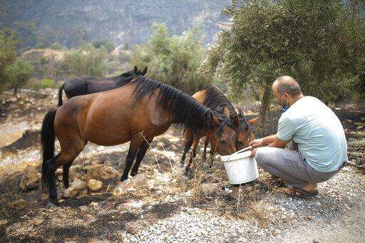 A man gives water to wilde horses in Akcayaka village in Milas area of the Mugla province, Turkey, Friday Aug. 6, 2021. Thousands of people fled wildfires burning out of control in Greece and Turkey on Friday, as a protracted heat wave turned forests into tinderboxes that threatened populated areas, electricity installations and historic sites. (AP Photo/Emre Tazegul) The Associated Press