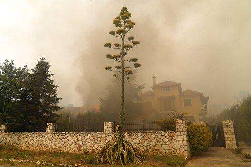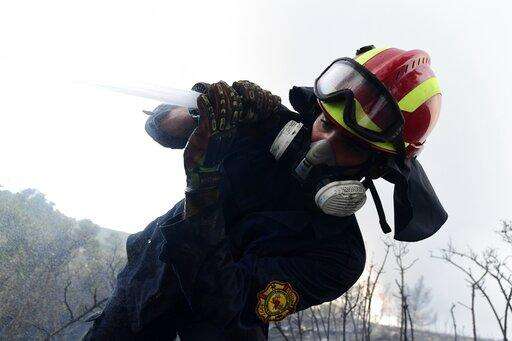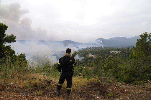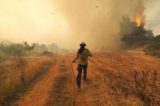 DROSOPIGI, Greece (AP) - Wildfires raged uncontrolled through Greece and Turkey for yet another day Friday, forcing thousands to flee by land and sea, and killing a volunteer firefighter on the fringes of Athens in a huge forest blaze that threatened the Greek capital's most important national park.