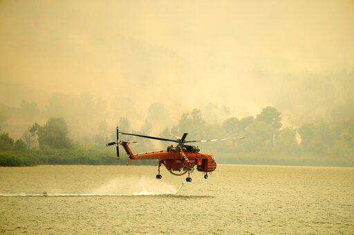 An helicopter fills water from Marathon Lake about 36 kilometres (22 miles) north of Athens, Greece, Friday, Aug. 6, 2021. Thousands of people fled wildfires burning out of control in Greece and Turkey on Friday, as a protracted heat wave turned forests into tinderboxes and flames threatened populated areas, electricity installations and historic sites. (AP Photo/Thanassis Stavrakis) The Associated Press