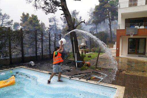 A man throws water from a swimming pool as the fire approaches his house in Ippokratios Politia village, about 35 kilometres (21 miles) north of Athens, Greece, Friday, Aug. 6, 2021. Thousands of people fled wildfires burning out of control in Greece and Turkey on Friday, as a protracted heat wave turned forests into tinderboxes and flames threatened populated areas, electricity installations and historic sites. (AP Photo/Thanassis Stavrakis) The Associated Press