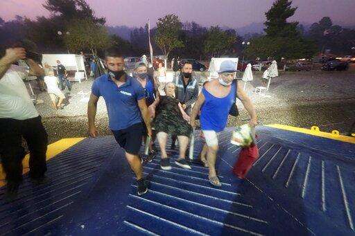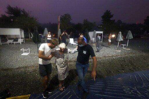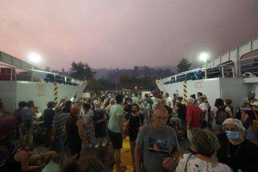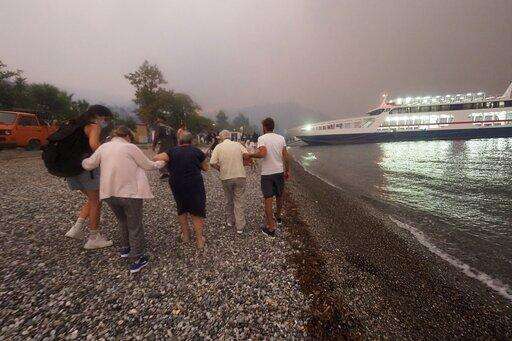People embark a ferry during an evacuation from Kochyli beach as wildfire approaches near Limni village on the island of Evia, about 160 kilometers (100 miles) north of Athens, Greece, Friday, Aug. 6, 2021. Thousands of people fled wildfires burning out of control in Greece and Turkey on Friday, including a major blaze just north of the Greek capital of Athens that claimed one life, as a protracted heat wave left forests tinder-dry and flames threatened populated areas and electricity installations. (AP Photo/Thodoris Nikolaou) The Associated Press