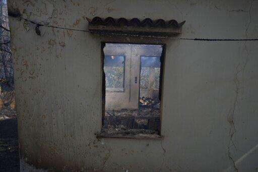 A burnt house after a wildfire in Drosopigi village, about 28 kilometres (27 miles) north of Athens, Greece, Friday, Aug. 6, 2021. Thousands of residents of the Greek capital have fled to safety from a wildfire that burned for a fourth day north of Athens as crews battle to stop the flames reaching populated areas, electricity installations and historic sites. (AP Photo/Thanassis Stavrakis) The Associated Press