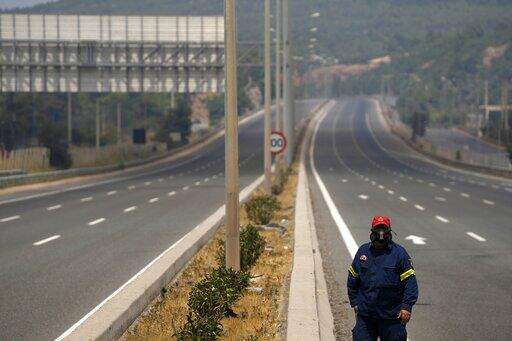 A firefighters walks on the closed highway at during a wildfire in Kapandriti village, about 38 kilometres (23 miles) north of Athens, Greece, Friday, Aug. 6, 2021. Thousands of people fled wildfires burning out of control in Greece and Turkey on Friday, as a protracted heat wave turned forests into tinderboxes and flames threatened populated areas, electricity installations and historic sites. (AP Photo/Thanassis Stavrakis) The Associated Press