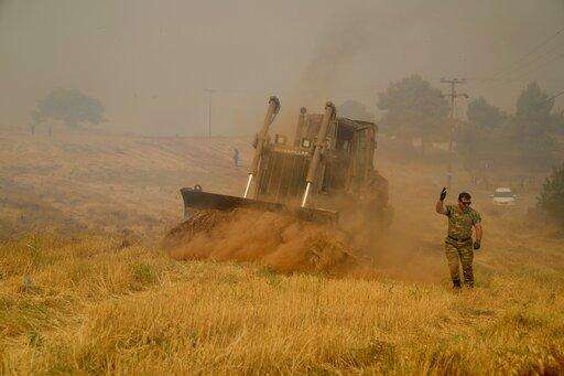 A military bulldozer opens fire break during a wildfire in Agios Stefanos, in northern Athens, Greece, Friday, Aug. 6, 2021. Thousands of people have fled wildfires burning out of control in Greece and Turkey, including a major blaze just north of the Greek capital of Athens that left one person dead. (AP Photo/Thanassis Stavrakis) The Associated Press