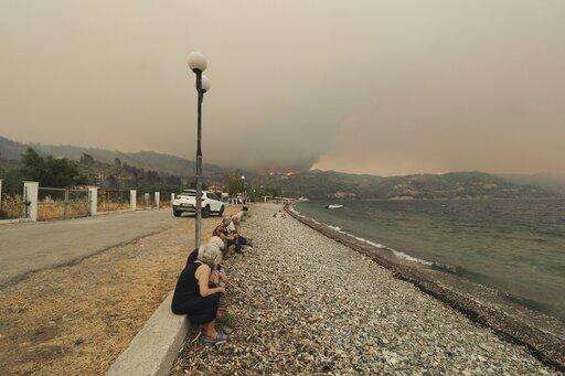 People sit on the beach as a wildfire approaches Limni village on the island of Evia, about 160 kilometers (100 miles) north of Athens, Greece, Friday, Aug. 6, 2021. Thousands of people fled wildfires burning out of control in Greece and Turkey on Friday, including a major blaze just north of the Greek capital of Athens that claimed one life, as a protracted heat wave left forests tinder-dry and flames threatened populated areas and electricity installations. (AP Photo/Thodoris Nikolaou) The Associated Press