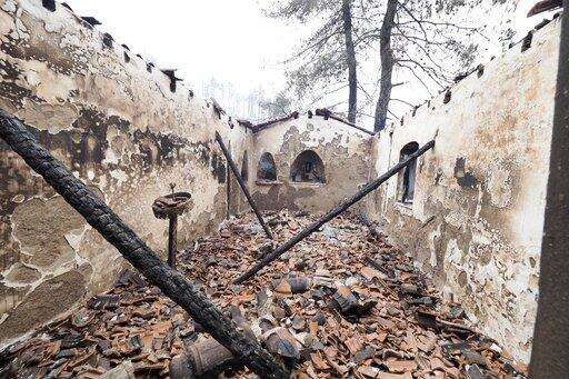 A burnt Greek Orthodox chapel during a wildfire in Kirinthos village on the island of Evia, about 135 kilometers (84 miles) north of Athens, Greece, Friday, Aug. 6, 2021. Thousands of people fled wildfires burning out of control in Greece and Turkey on Friday, including a major blaze just north of the Greek capital of Athens that claimed one life, as a protracted heat wave left forests tinder-dry and flames threatened populated areas and electricity installations. (AP Photo/Thodoris Nikolaou) The Associated Press