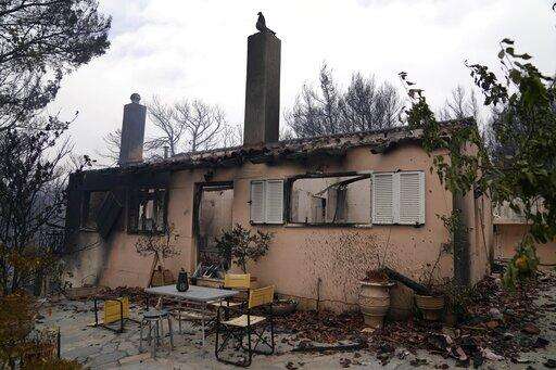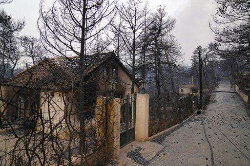 A burnt house in Kryoneri, in northern Athens, Greece, Friday, Aug. 6, 2021. Thousands of people have fled wildfires burning out of control in Greece and Turkey, including a major blaze just north of the Greek capital of Athens that left one person dead. (AP Photo/Petros Karadjias) The Associated Press