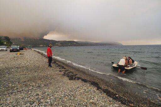 People use a dinghy as a wildfire approaches Limni village on the island of Evia, about 160 kilometers (100 miles) north of Athens, Greece, Friday, Aug. 6, 2021. Thousands of people fled wildfires burning out of control in Greece and Turkey on Friday, including a major blaze just north of the Greek capital of Athens that claimed one life, as a protracted heat wave left forests tinder-dry and flames threatened populated areas and electricity installations. (AP Photo/Thodoris Nikolaou) The Associated Press