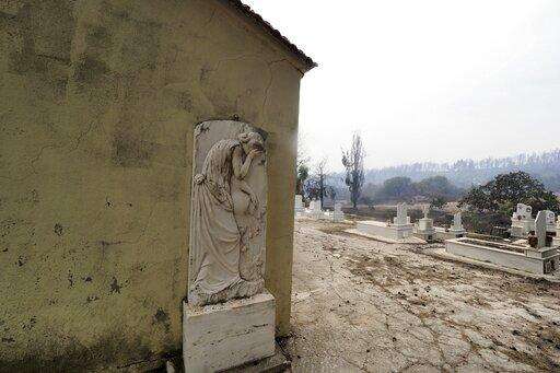 A burnt cemetery during a wildfire in Kirinthos village on the island of Evia, about 135 kilometers (84 miles) north of Athens, Greece, Friday, Aug. 6, 2021. Thousands of people fled wildfires burning out of control in Greece and Turkey on Friday, including a major blaze just north of the Greek capital of Athens that claimed one life, as a protracted heat wave left forests tinder-dry and flames threatened populated areas and electricity installations. (AP Photo/Thodoris Nikolaou) The Associated Press
