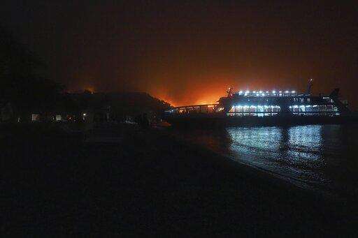 A ferry approaches Kochyli beach to evacuate people near Limni village on the island of Evia, about 160 kilometers (100 miles) north of Athens, Greece, Friday, Aug. 6, 2021. Thousands of people fled wildfires burning out of control in Greece and Turkey on Friday, including a major blaze just north of the Greek capital of Athens that claimed one life, as a protracted heat wave left forests tinder-dry and flames threatened populated areas and electricity installations. (AP Photo/Thodoris Nikolaou) The Associated Press