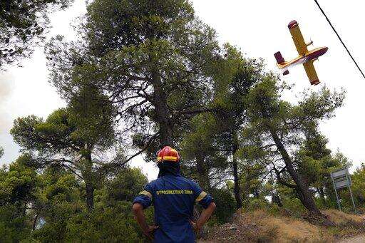 An aircraft operates as a firefighter looks on during a wildfire in Ippokratios Politia village, about 35 kilometres (21 miles) north of Athens, Greece, Friday, Aug. 6, 2021. Thousands of people fled wildfires burning out of control in Greece and Turkey on Friday, as a protracted heat wave turned forests into tinderboxes and flames threatened populated areas, electricity installations and historic sites. (AP Photo/Thanassis Stavrakis) The Associated Press