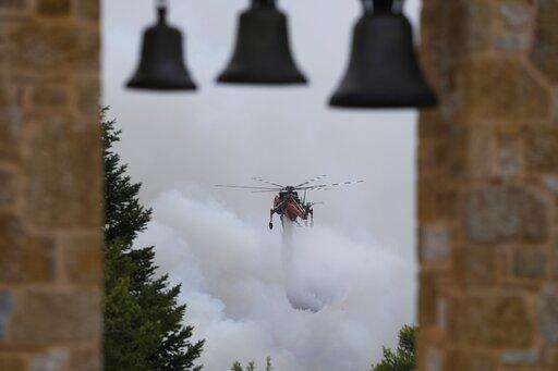 An helicopter drops water over a fire in Ippokratios Politia village, about 35 kilometres (21 miles) north of Athens, Greece, Friday, Aug. 6, 2021. Thousands of residents of the Greek capital have fled to safety from a wildfire that burned for a fourth day north of Athens as crews battle to stop the flames reaching populated areas, electricity installations and historic sites. (AP Photo/Thanassis Stavrakis) The Associated Press