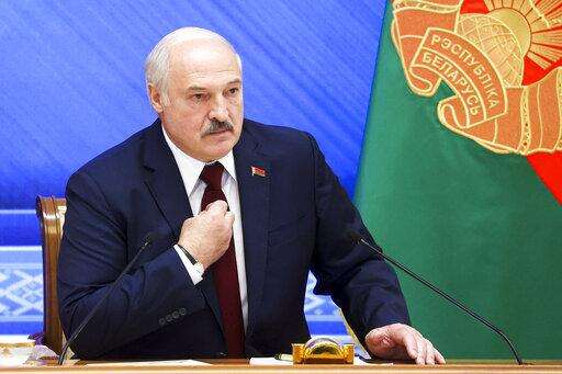 Belarusian President Alexander Lukashenko attends an annual press conference in Minsk, Belarus, Monday, Aug. 9, 2021. Belarus' authoritarian leader on Monday charged that the opposition was plotting a coup in the runup to last year's presidential election that triggered a monthslong wave of mass protests. President Alexander Lukashenko held his annual press conference on Monday, the one-year anniversary of the vote that handed him a sixth term in office but was denounced by the opposition and the West as rigged. (Pavel Orlovsky/BelTA photo via AP)