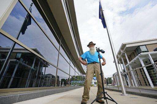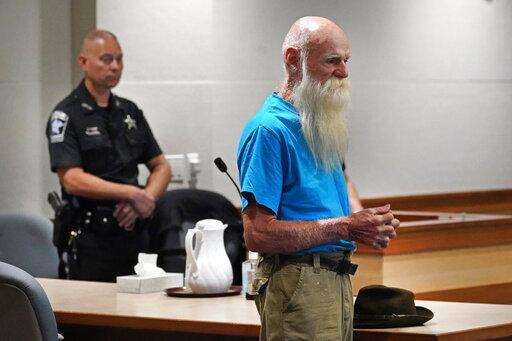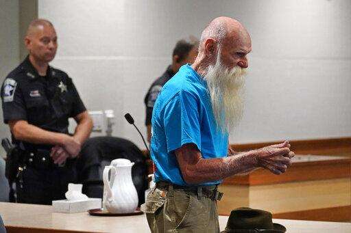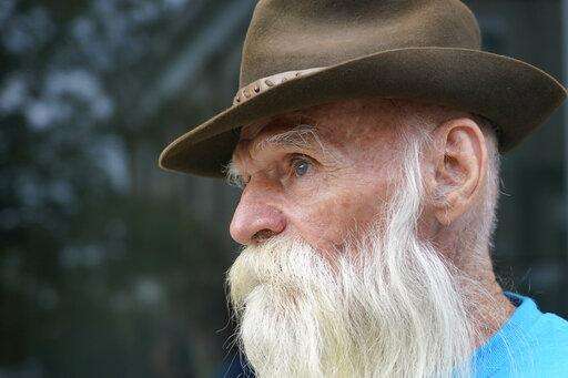 David Lidstone, an off-the-grid New Hampshire hermit known to locals as "River Dave," speaks during a status conference hearing in Merrimack County Superior Court, Wednesday, Aug. 11, 2021, in Concord, N.H. The court determined that Lidstone will be able to collect his cats, chickens, and remaining possessions from the site he has lived on for 27 years. Lidstone, who still believes he was not on private land, also was given permission to hire a surveyor to give him "peace of mind," Judge Andrew Schulman said. (AP Photo/Elise Amendola, Pool)
