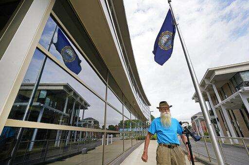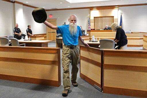 David Lidstone, an off-the-grid New Hampshire hermit known to locals as "River Dave," leaves a status conference hearing in Merrimack County Superior Court, Wednesday, Aug. 11, 2021, in Concord, N.H. The court determined that Lidstone will be able to collect his cats, chickens, and remaining possessions from the site he has lived on for 27 years. Lidstone, who still believes he was not on private land, also was given permission to hire a surveyor to give him "peace of mind," Judge Andrew Schulman said. (AP Photo/Elise Amendola, Pool)