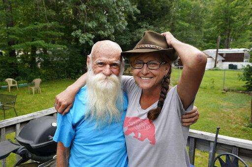 David Lidstone, 81, left, stands for a photograph with his friend Jodie Gedeon, Aug. 10, 2021, in Boscawen, N.H. Lidstone, an off-the-grid New Hampshire hermit known to locals as "River Dave," had been living in a cabin in the woods along the Merrimack River, in Canterbury, N.H. Lidstone had been squatting in the woods for over 27 years. He was jailed July 15, 2021 on a civil contempt sanction and was told he'd be released if he agreed to leave the cabin, that has since burnt down. (AP Photo/Steven Senne)