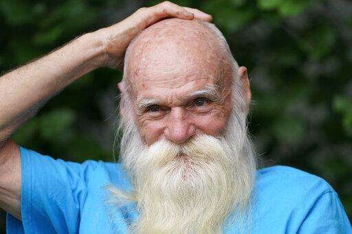 David Lidstone, 81, speaks with reporters during an interview Tuesday, Aug. 10, 2021, in Boscawen, N.H. Lidstone, an off-the-grid New Hampshire hermit known to locals as "River Dave," had been living in a cabin in the woods along the Merrimack River, in Canterbury, N.H., for nearly three decades. He was jailed July 15, 2021 on a civil contempt sanction and was told he'd be released if he agreed to leave the cabin, that has since burnt down. (AP Photo/Steven Senne)