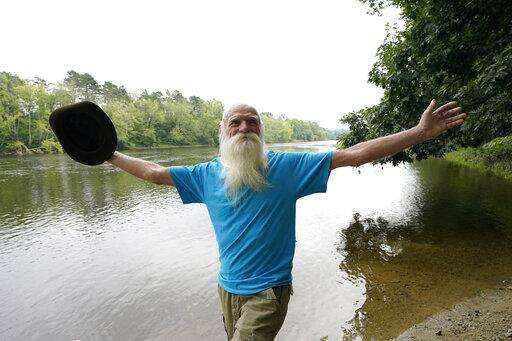 David Lidstone, 81, raises his arms while walking along near the Merrimack River, Tuesday, Aug. 10, 2021, in Boscawen, N.H. Lidstone, an off-the-grid New Hampshire hermit known to locals as "River Dave," had been living in a cabin in the woods along the Merrimack River, in Canterbury, N.H., for nearly three decades. He was jailed July 15, 2021 on a civil contempt sanction and was told he'd be released if he agreed to leave the cabin, that has since burnt down. (AP Photo/Steven Senne)