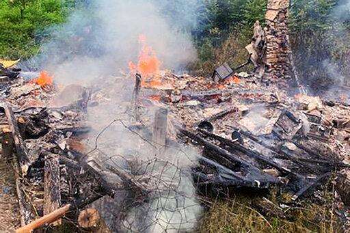 In this photo provided by the Canterbury (New Hampshire) Fire Department, smoke rises Wednesday, Aug. 4, 2021, from the burnt remains of a cabin in Canterbury, N.H., inhabited by 81-year-old David Lidstone, who for 27 years has lived in the woods of New Hampshire along the Merrimack River in the once small, solar-paneled cabin. "River Dave," as he's known by boaters and kayakers, has been jailed since July 15 after being accused of squatting for 27 years on the private property. The Canterbury fire chief said there will be an investigation into the fire. (Canterbury Fire Department via AP)