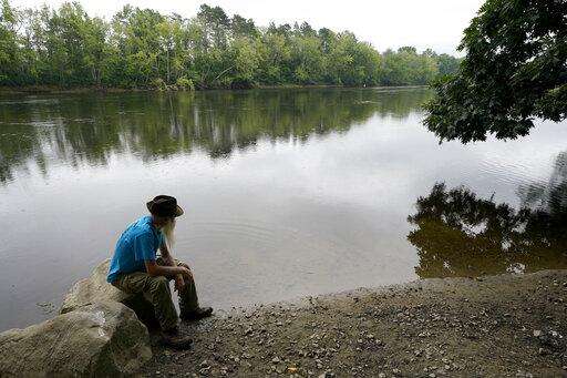 David Lidstone, 81, sits near the Merrimack River, Tuesday, Aug. 10, 2021, in Boscawen, N.H. Lidstone, an off-the-grid New Hampshire hermit known to locals as "River Dave," had been living in a cabin in the woods along the Merrimack River, in Canterbury, N.H., for nearly three decades. He was jailed July 15, 2021 on a civil contempt sanction and was told he'd be released if he agreed to leave the cabin, that has since burnt down. (AP Photo/Steven Senne)