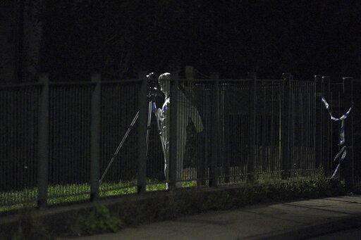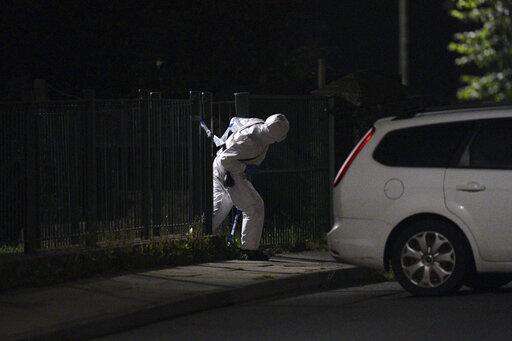 An officer in a forensics suit inspects the scene of incident on Biddick Drive, in the Keyham area of Plymouth, southwest England, Thursday, Aug. 12, 2021. Police in southwest England said several people were killed, including the suspected shooter, in the city of Plymouth Thursday in a 'serious firearms incident' that wasn't terror-related. (Ben Birchall/PA via AP)