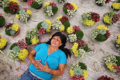 Elisa Xolalpa, who survived an acid attack when tied to a post by her ex-partner 20 years ago when she was 18, poses for a portrait inside her greenhouse where she grows flowers to sell at a market in Mexico City, Sunday, May 30, 2021. 'I have to turn this pain into something else,' Xolalpa said. For now, that means demanding justice and not being silent. (AP Photo/Ginnette Riquelme)