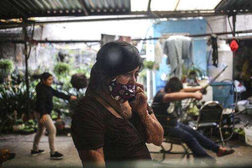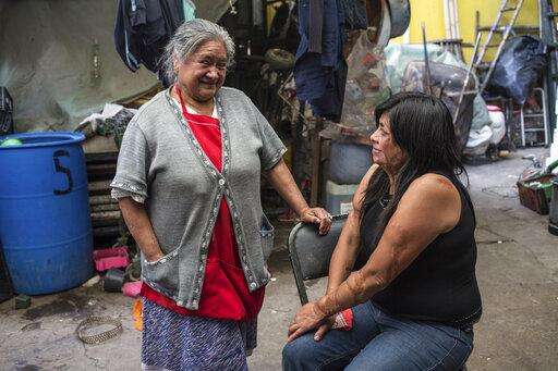 Elisa Xolalpa, who survived an acid attack when tied to a post by her ex-partner 20 years ago when she was 18, talks with fellow plant grower Celestino Ovaldo Salvador on the way to her greenhouse where she grows plants to sell at a market in Mexico City, Saturday, June 12, 2021. Survivors of acid attacks like Xolalpa are banding together and raising their voices in Mexico despite the country's sky-high violence _ especially toward women and staggering levels of impunity. (AP Photo/Ginnette Riquelme)