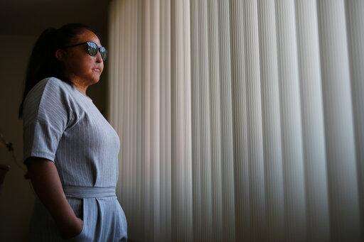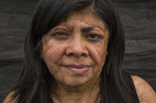 Carmen Sanchez, who survived an acid attack by her ex-partner seven years ago when she was 30, poses for a portrait in Mexico, Sunday, May 30, 2021. Sanchez has undergone 61 surgeries and must protect her skin and right eye from the sun. When Sanchez filed a complaint against her attacker the year she was attacked in 2014, charges of 'serious injuries' were not enough to arrest him. But in 2021, an investigation was reopened as an attempted femicide case, for which he was then arrested, and she is waiting to know if he will be formally accused. (AP Photo/Ginnette Riquelme)