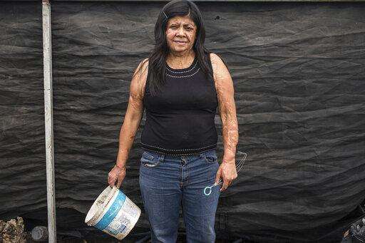 Elisa Xolalpa poses for a portrait during an interview recounting how she survived an acid attack while tied to a post by her ex-partner, damaging her face, chest, back, arms, hands, and making her lose her right finger, as she works at her greenhouse where grows plants to sell at a market in Mexico City, Saturday, June 12, 2021. The attack was 20 years ago when she was age 18, but he was arrested for the first time this year, facing a charge of domestic violence. (AP Photo/Ginnette Riquelme)