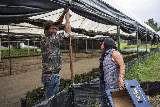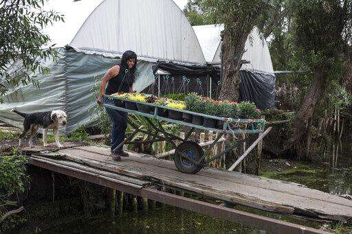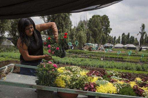 Elisa Xolalpa, who survived an acid attack while tied to a post by her ex-partner 20 years ago when she was 18, loads plants into a wheelbarrow at her greenhouse where she grows flowers to sell at a market in Mexico City, Saturday, June 12, 2021. Xolalpa is focused on preparing herself mentally for a new court hearing for her attacker, who was finally arrested in February 2021. (AP Photo/Ginnette Riquelme)