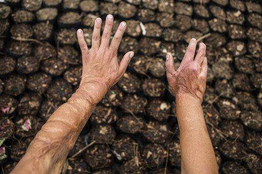 Elisa Xolalpa shows the burn marks on her hands and arms caused by an acid attack while tied to a post by her ex-partner 20 years ago when she was 18, during an interview at her greenhouse where she grows plants to sell at a market in Mexico City, Saturday, June 12, 2021. The acid dissolved the ropes, but also her clothes and her body as she ran half-naked for help. (AP Photo/Ginnette Riquelme)