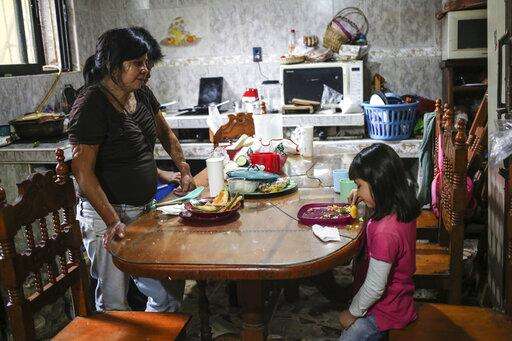Elisa Xolalpa, who survived an acid attack while tied to a post by her ex-partner 20 years ago when she was 18, waits for her six-year-old daughter Monserrat to finish lunch in the kitchen of Elisa's parents' home in Mexico City, Sunday, July 4, 2021. Xolalpa recognizes that one day she will have to explain to her three daughters, product of another relationship, the attack that changed her life and for a time left her wanting to die. (AP Photo/Ginnette Riquelme)