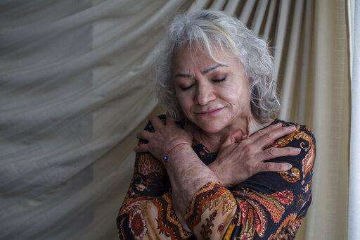 Martha Avila, who survived an acid attack by her former son-in-law four years ago when she was 59, embraces herself as she poses for a portrait at her home in the state of Mexico, Mexico, June 13, 2021. Avila's attack happened on International Women's Day in 2017 while she was at work, two years after her daughter had left her partner and was in hiding from him, burning her hands, face, neck and chest. The attack came after two incidents when he had thrown acid on the family car outside their home. After 15 surgeries, she expects to undergo more to help regain mobility. (AP Photo/Ginnette Riquelme)