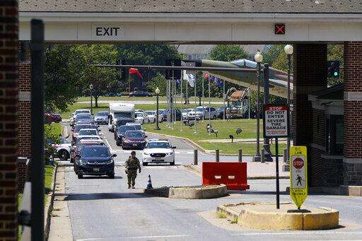 Security personnel stand at an entrance to Joint Base Anacostia-Bolling during a lockdown, Friday, Aug. 13, 2021, in Washington. The base was placed on lockdown after a report that an armed person was spotted on the base. (AP Photo/Patrick Semansky) The Associated Press