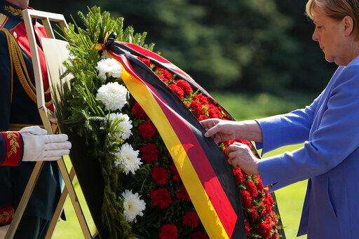 German Chancellor Angela Merkel, right, attends a wreath laying ceremony at the Tomb of Unknown Soldier in Moscow, Russia, Friday, Aug. 20, 2021, prior to talks with Russian President Vladimir Putin. The talks between Merkel and Putin are expected to focus on Afghanistan, the Ukrainian crisis and the situation in Belarus among other issues. (AP Photo/Alexander Zemlianichenko, Pool) The Associated Press