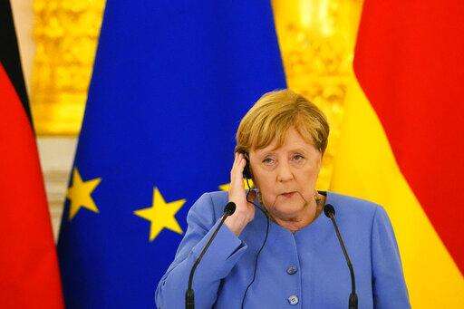 German Chancellor Angela Merkel attends a joint news conference with Russian President Vladimir Putin following their talks in the Kremlin in Moscow, Russia, Friday, Aug. 20, 2021. The talks between Merkel and Putin are expected to focus on Afghanistan, the Ukrainian crisis and the situation in Belarus among other issues. (AP Photo/Alexander Zemlianichenko, Pool) The Associated Press