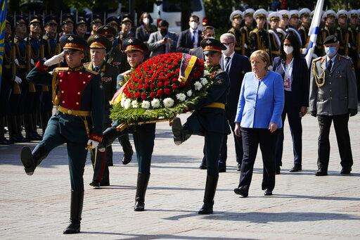 German Chancellor Angela Merkel, left, arrives for a wreath laying ceremony at the Tomb of Unknown Soldier in Moscow, Russia, Friday, Aug. 20, 2021, prior to talks with Russian President Vladimir Putin. The talks between Merkel and Putin are expected to focus on Afghanistan, the Ukrainian crisis and the situation in Belarus among other issues. (AP Photo/Alexander Zemlianichenko, Pool) The Associated Press