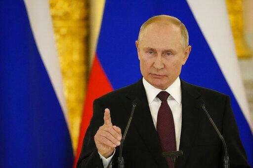 Russian President Vladimir Putin speaks during a joint news conference with German Chancellor Angela Merkel following their talks in the Kremlin in Moscow, Russia, Friday, Aug. 20, 2021. The talks between Merkel and Putin are expected to focus on Afghanistan, the Ukrainian crisis and the situation in Belarus among other issues. (AP Photo/Alexander Zemlianichenko, Pool) The Associated Press
