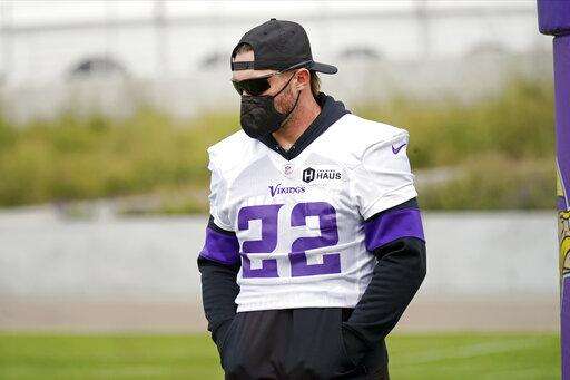 Minnesota Vikings free safety Harrison Smith (22) stands in the end zone wearing a medical face mask required by the team for unvaccinated players during the NFL football team's training camp, Thursday, Aug. 5, 2021, in Eagan, Minn. (AP Photo/Jim Mone) The Associated Press