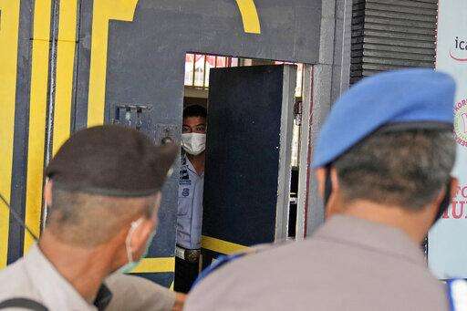Staff and police officers guard the main entrance gate of Tangerang prison in Tangerang on the outskirts of Jakarta, Indonesia, Wednesday, Sept. 8, 2021. A massive fire raged through the overcrowded prison early Wednesday, killing a number of inmates. (AP Photo/Dita Alangkara)