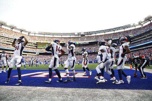Denver Broncos wide receiver Tim Patrick (81) celebrates with teammates after scoring a touchdown during the first half of an NFL football game against the New York Giants Sunday, Sept. 12, 2021, in East Rutherford, N.J. (AP Photo/Adam Hunger) The Associated Press