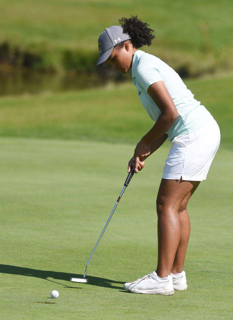 Prospect's Maia Johnson putts on the third hole during Saturday's golf invite at the Arboretum Club in Buffalo Grove.