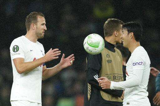 Tottenham's Son Heung-min throws the match ball to Tottenham's Harry Kane after he scored a hatrick, after the final whistle of the Europa Conference League Group G soccer match between Tottenham Hotspur and NS Mura at the Tottenham Hotspur Stadium in London, Thursday, Sept. 30, 2021. (AP Photo/Matt Dunham)